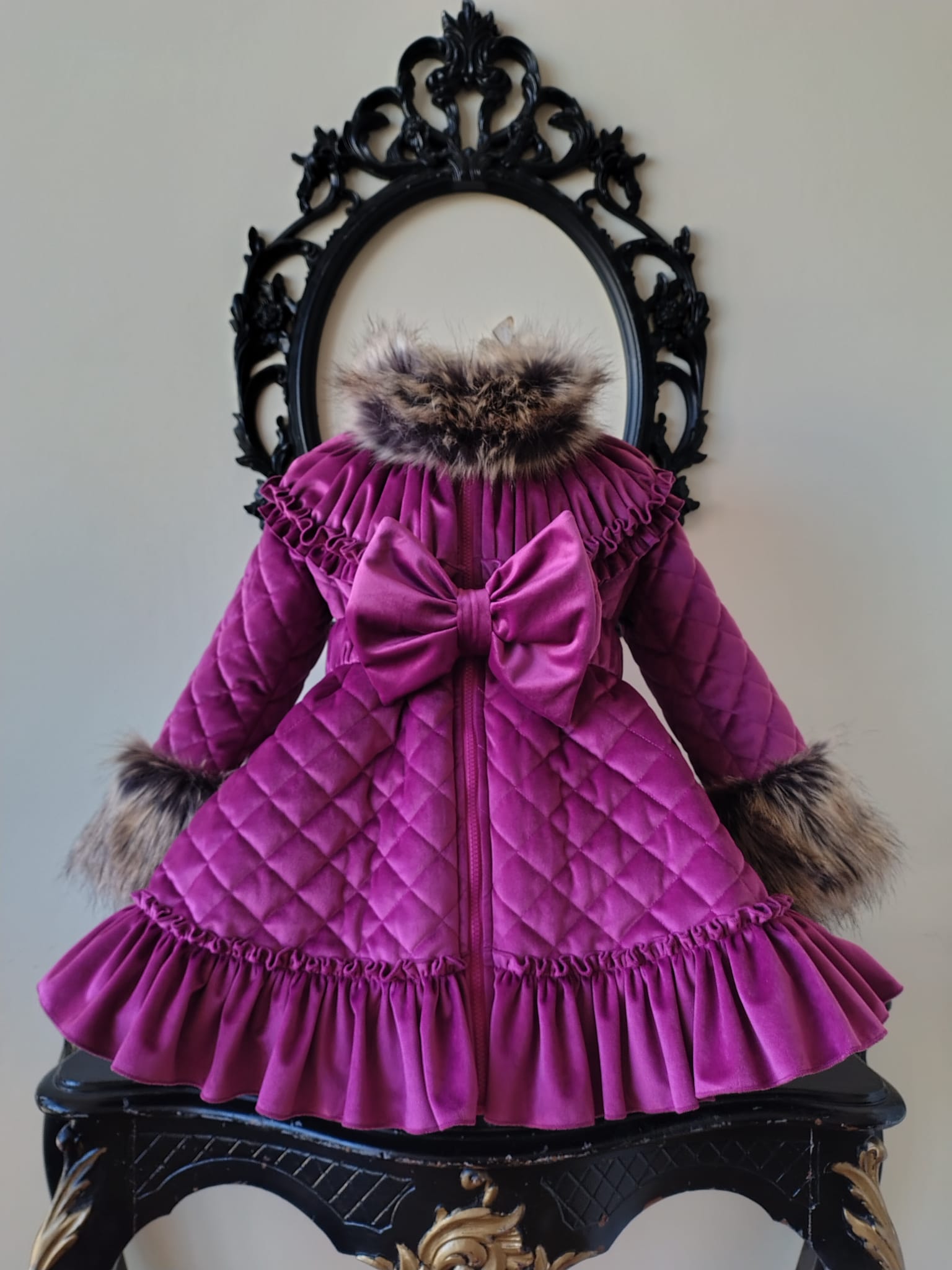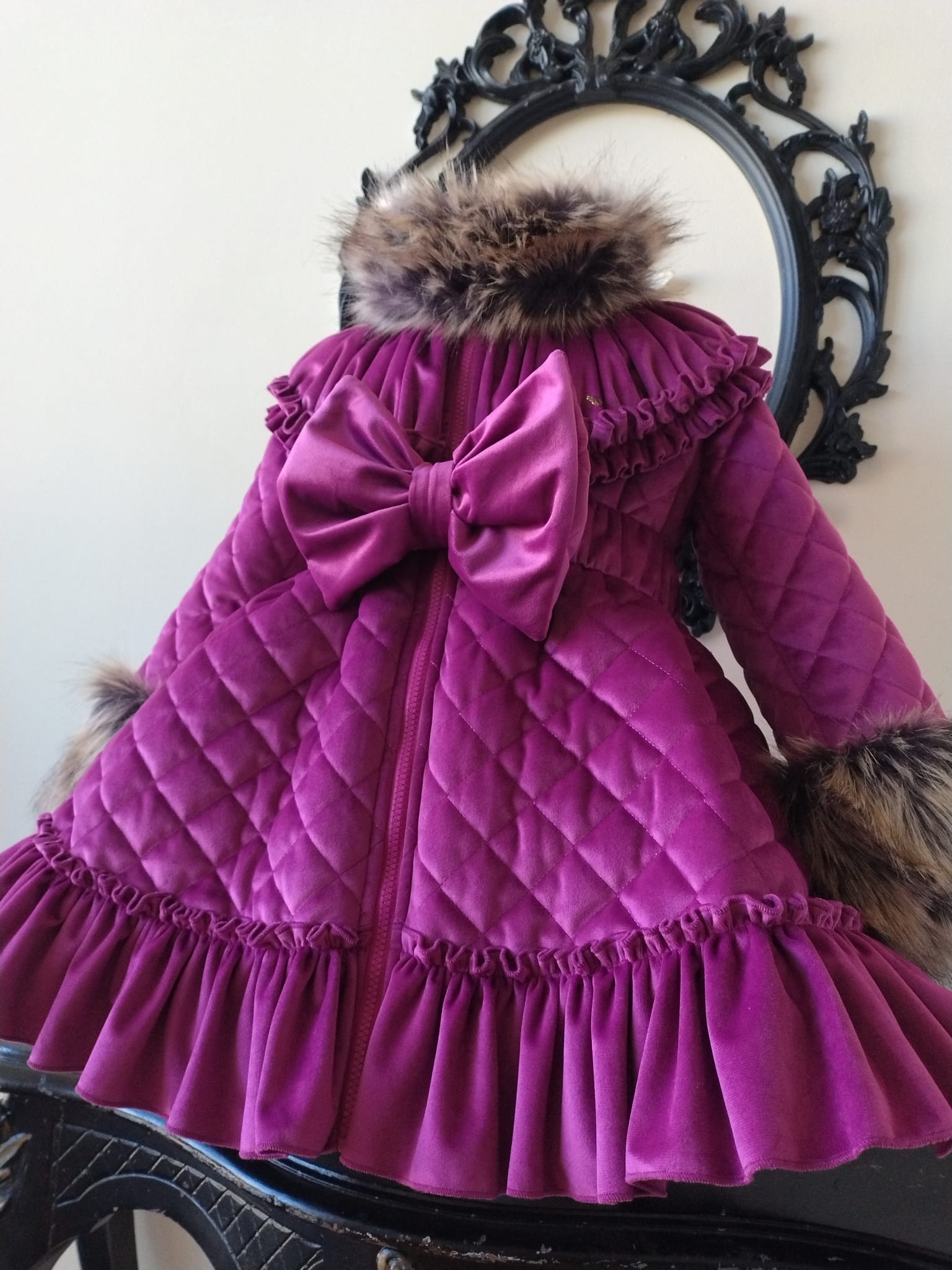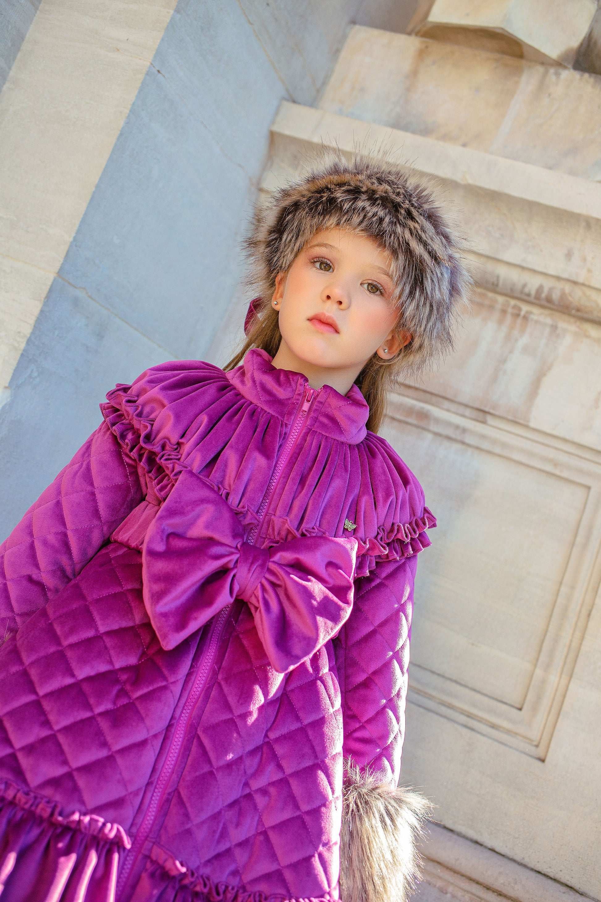 Abrigo infantil exclusivo, confeccionado en tejido fucsia de alta calidad con detalles artesanales. Diseño atemporal y elegante de Meriche Alta Costura.