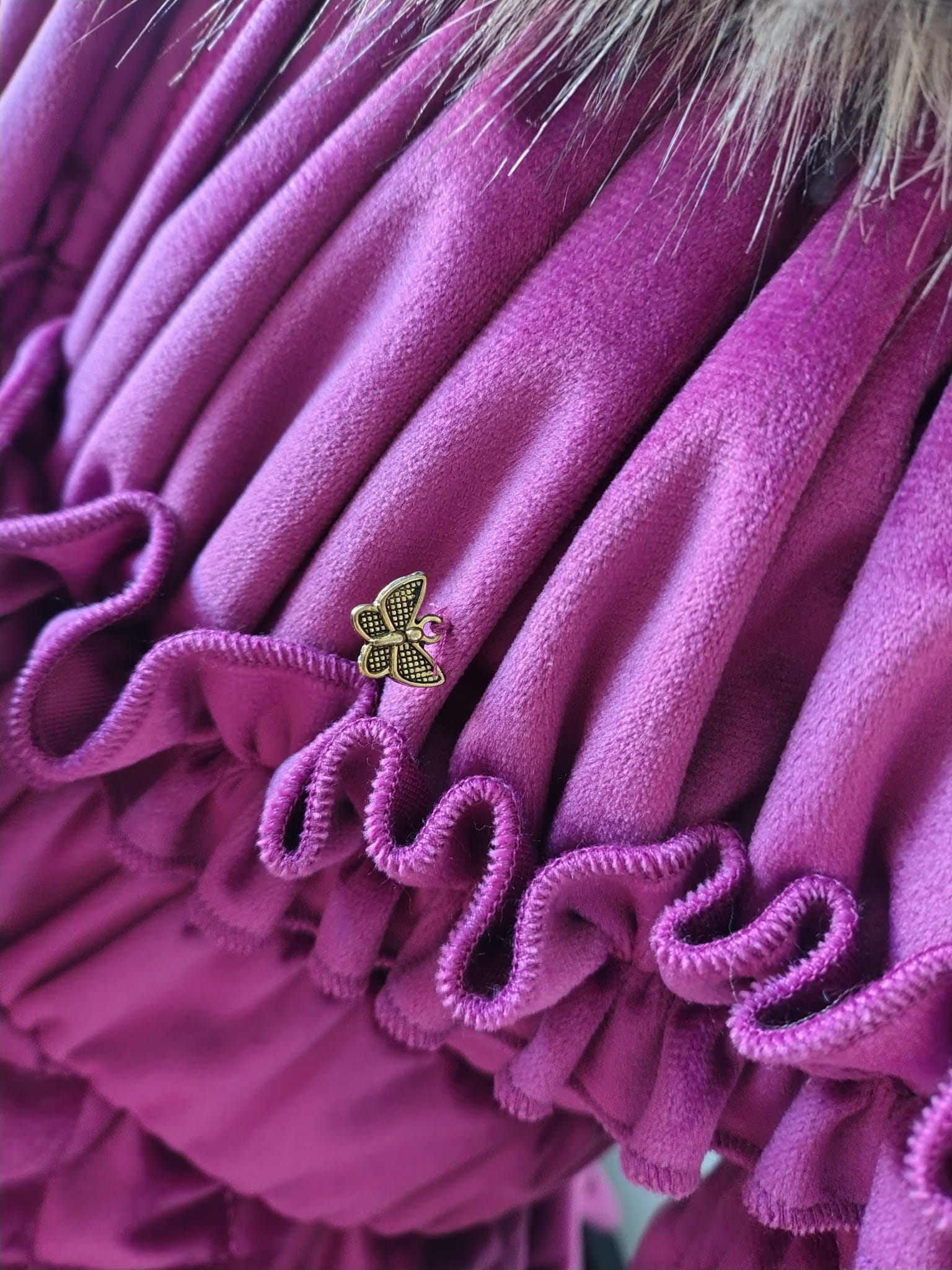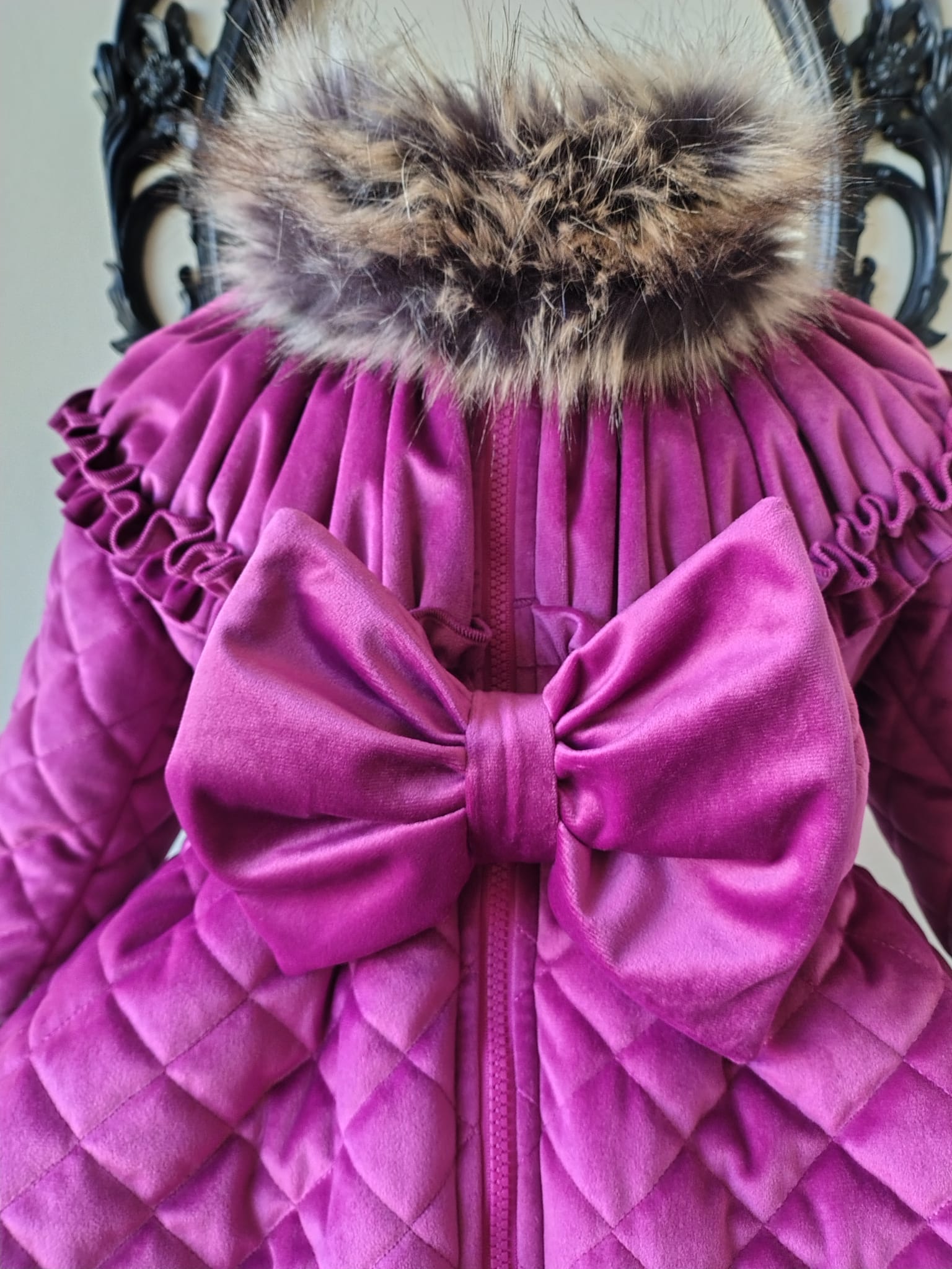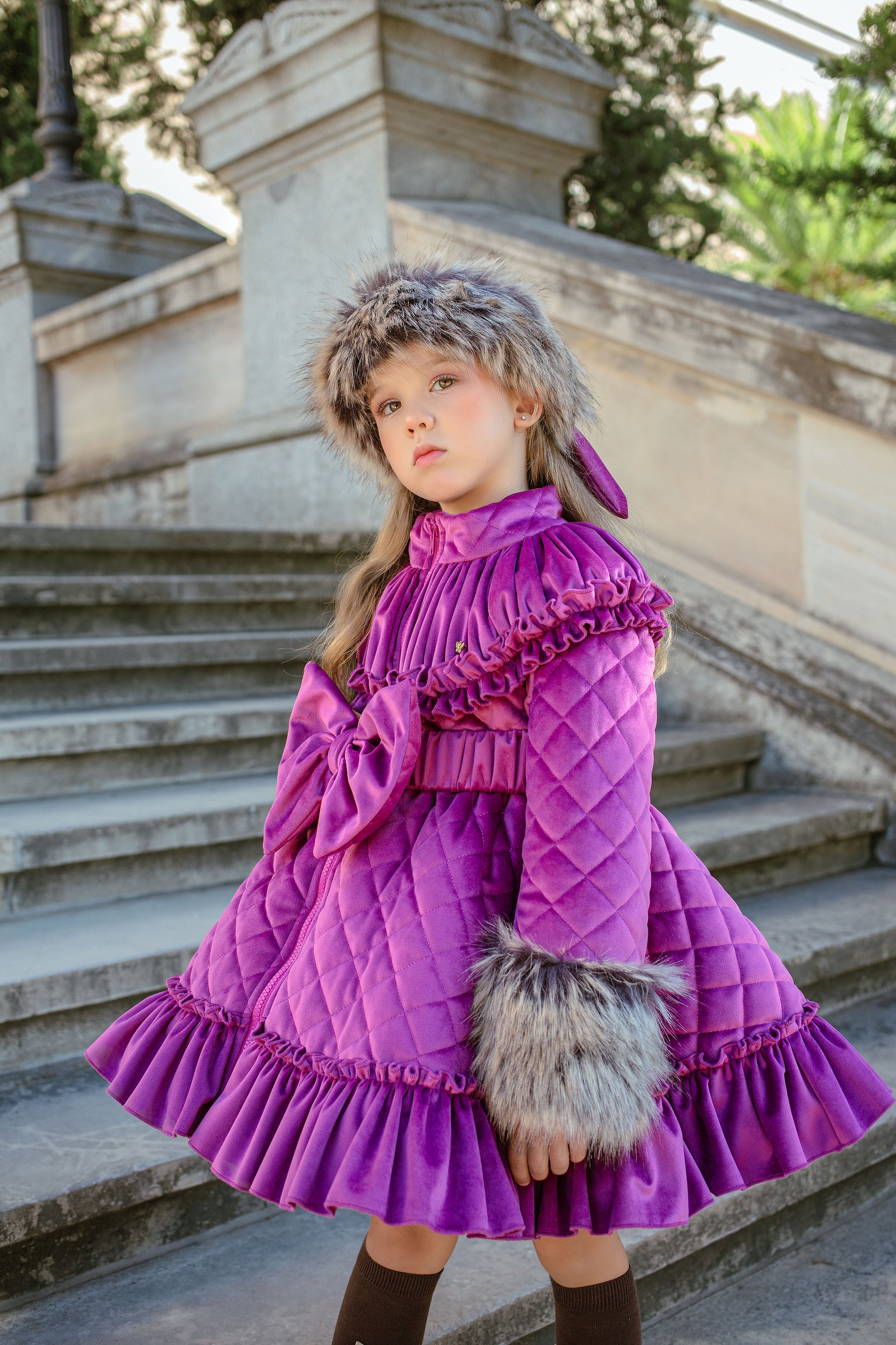 Abrigo infantil exclusivo, confeccionado en tejido fucsia de alta calidad con detalles artesanales. Diseño atemporal y elegante de Meriche Alta Costura.