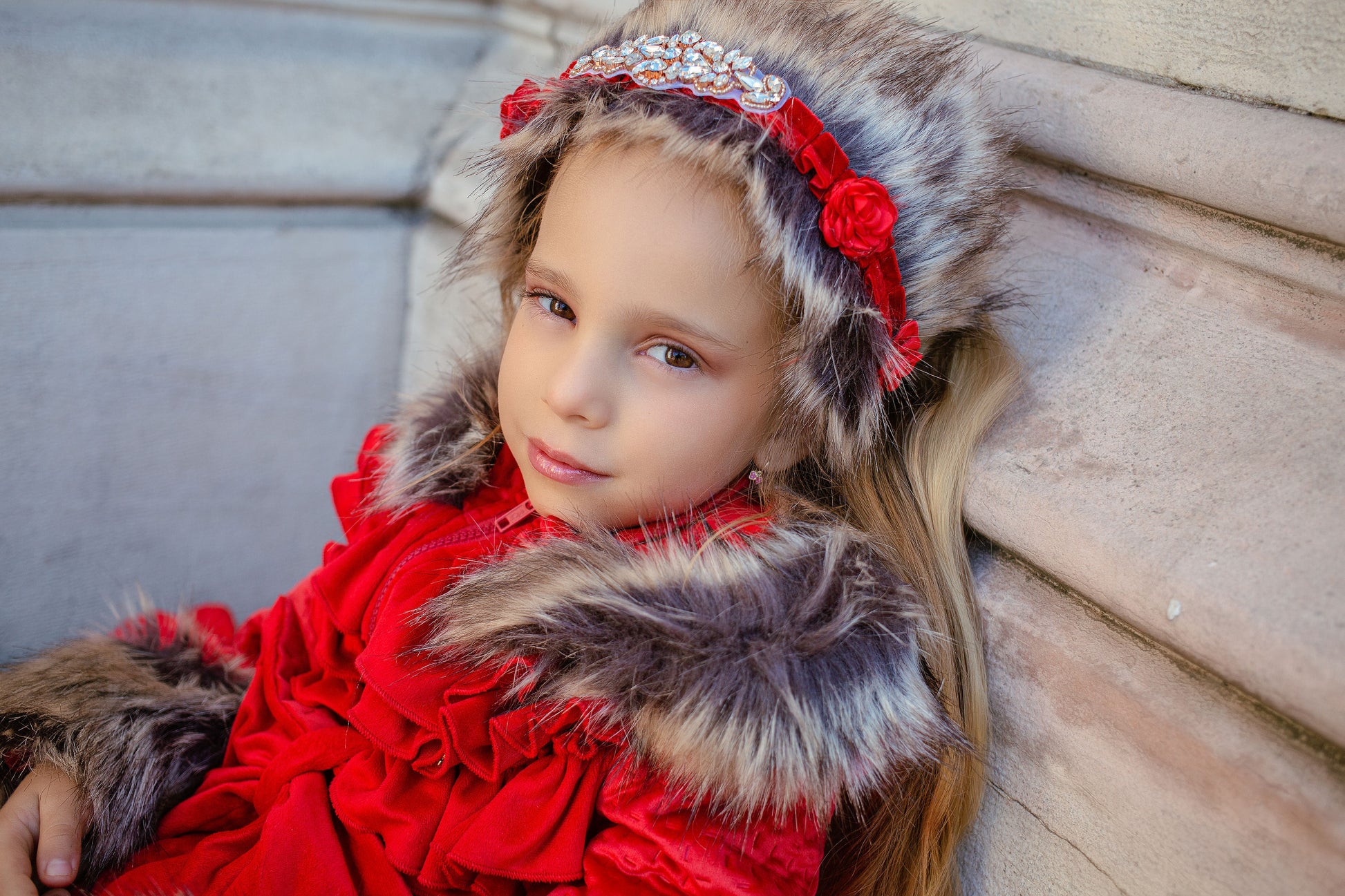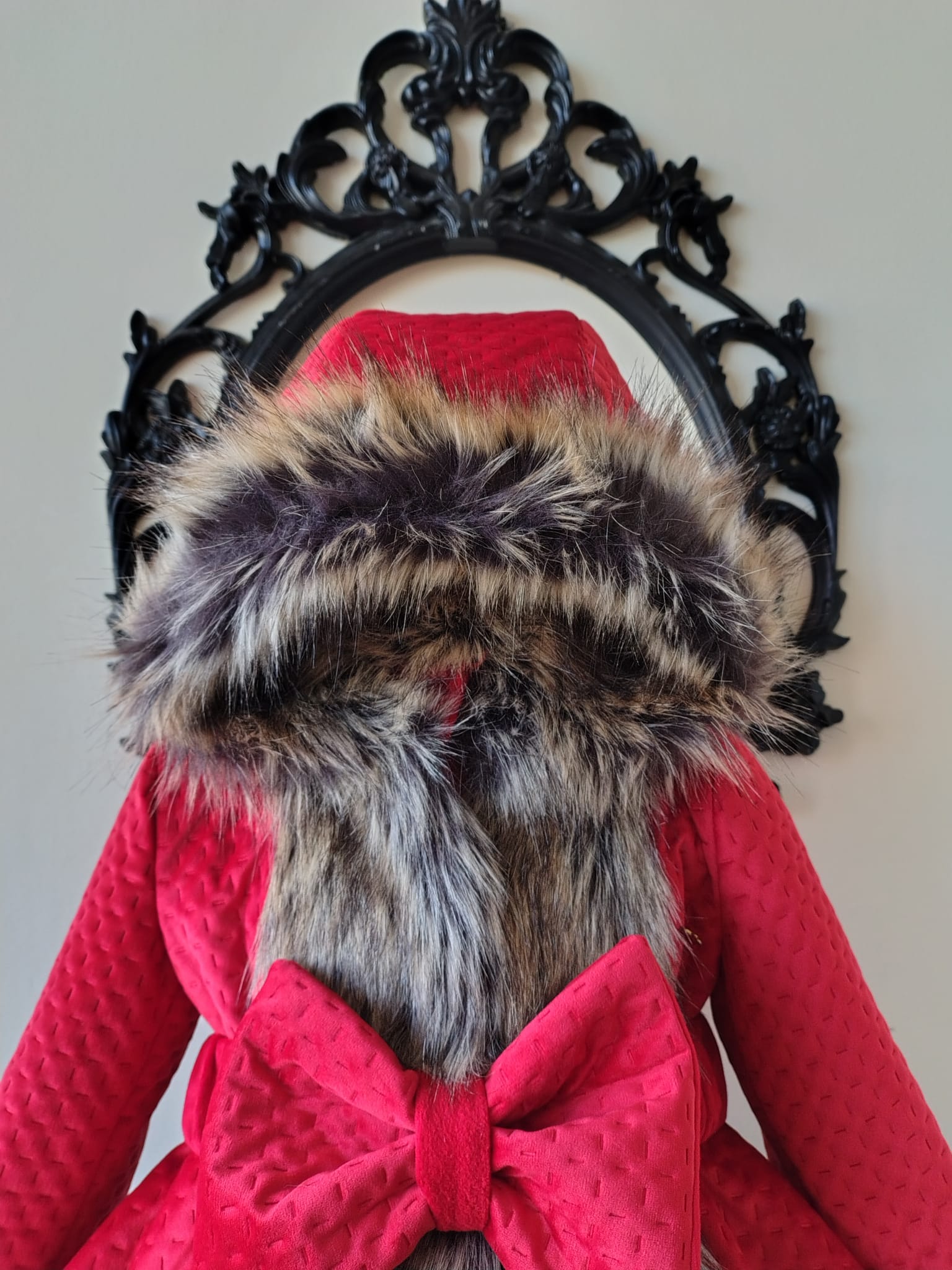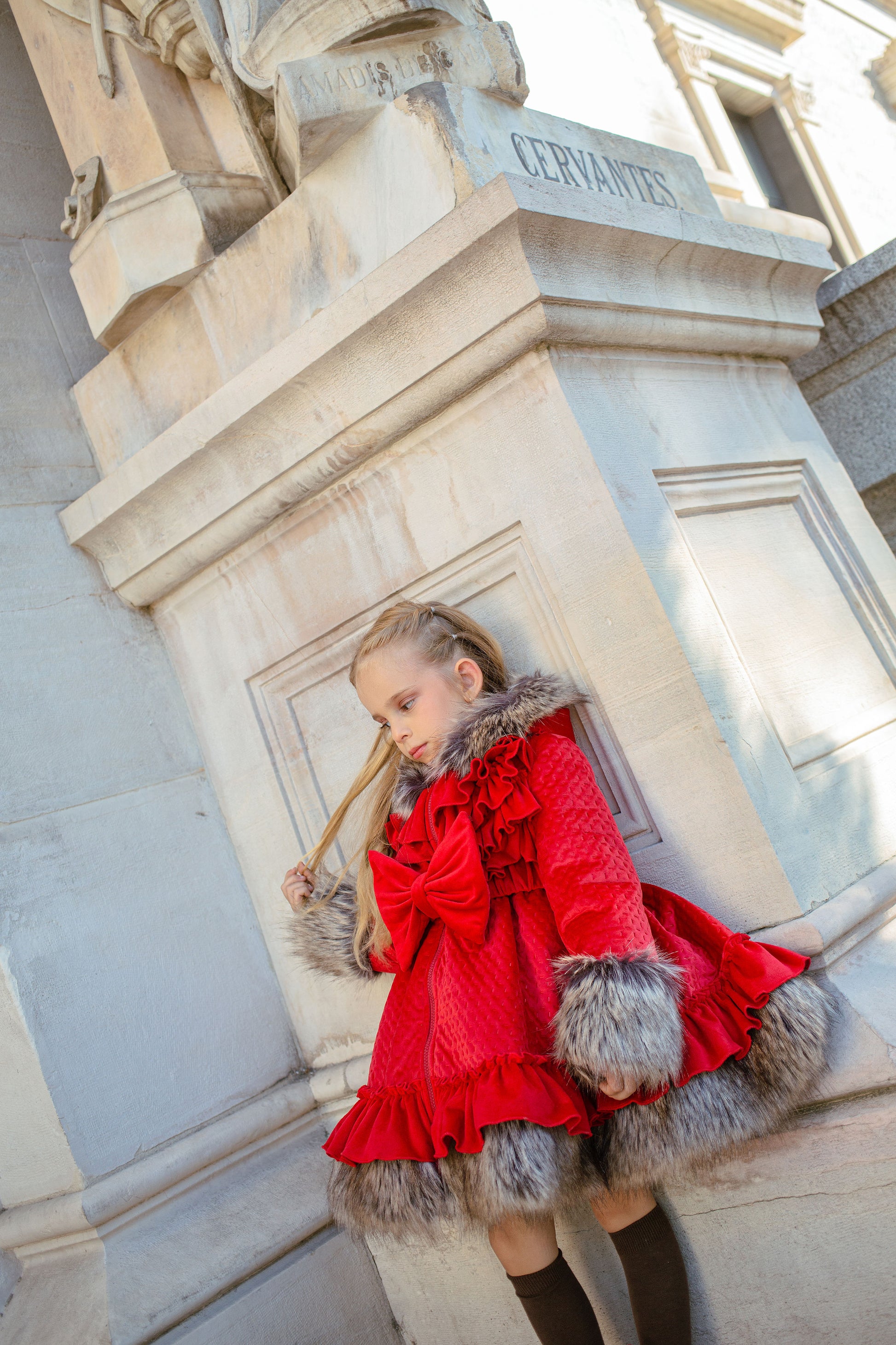 Abrigo infantil exclusivo, confeccionado en tejido rojo de alta calidad con detalles artesanales. Diseño atemporal y elegante de Meriche Alta Costura.