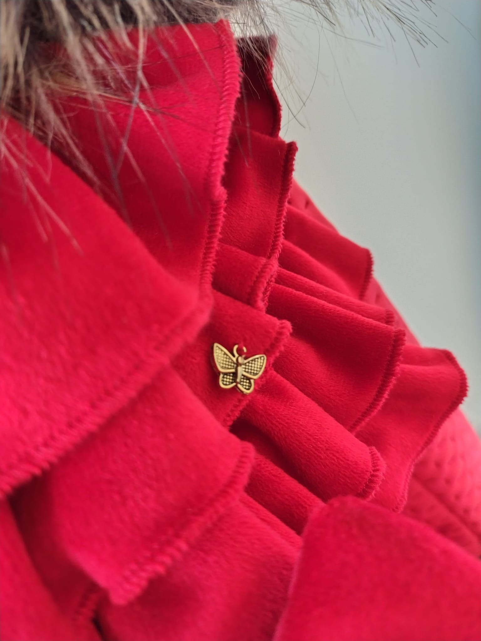 El cuello de terciopelo plisado en tono rojo y los detalles bordados artesanalmente en puños y bajo evocan el encanto de la moda de herencia: prendas que trascienden el tiempo y se convierten en verdaderos tesoros familiares.