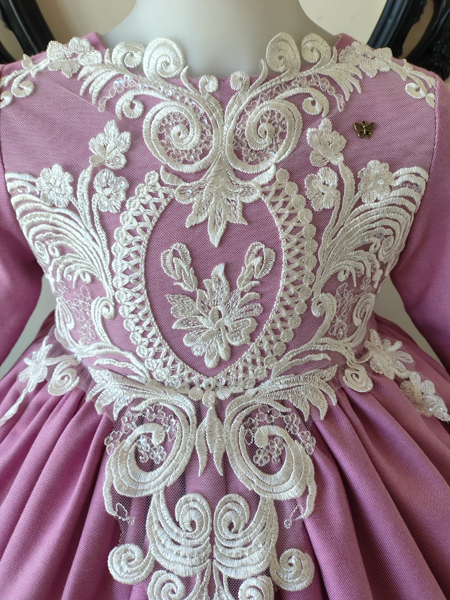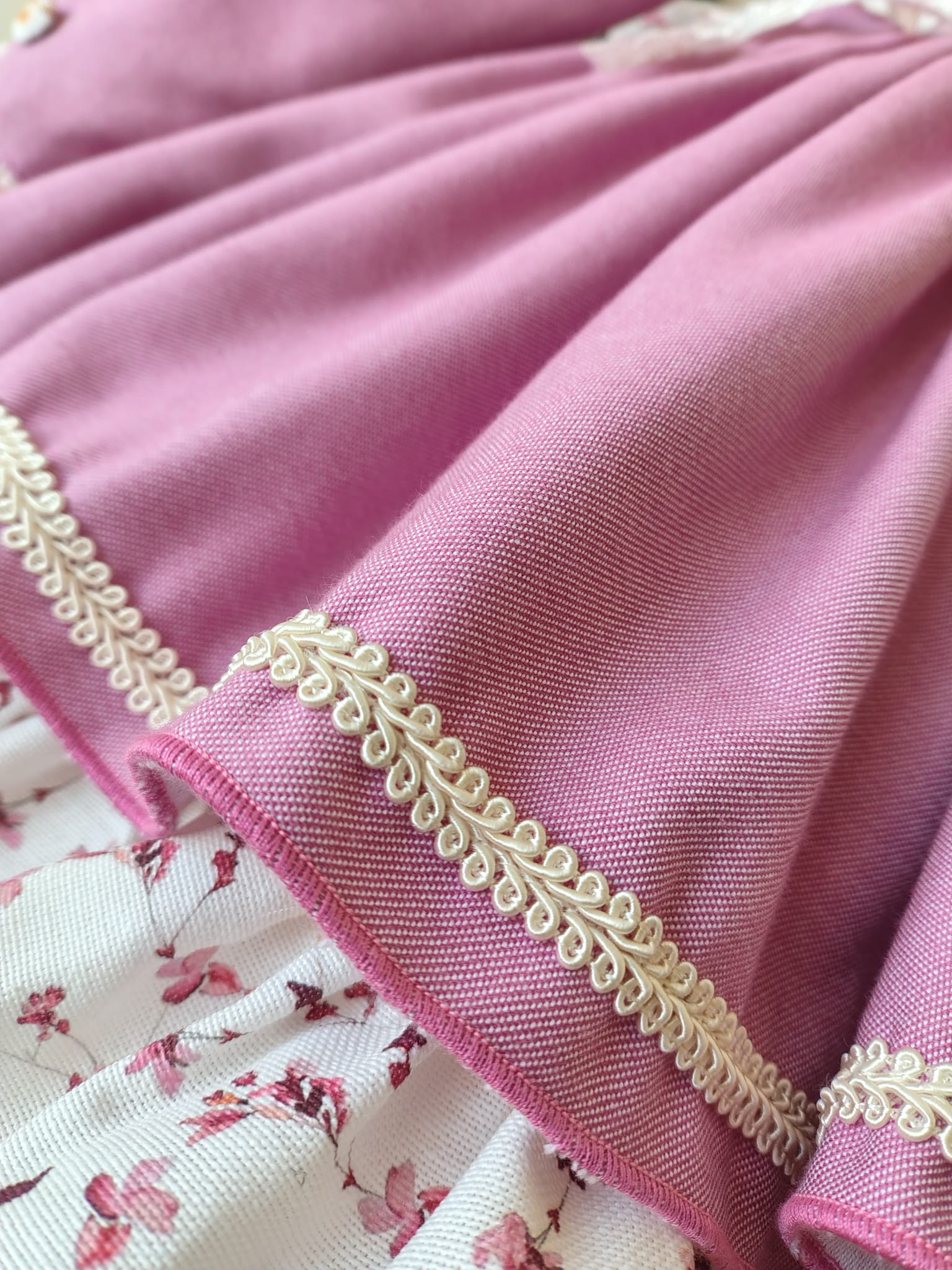 Descubre *Lysandra*, un diseño de alta costura infantil que representa la esencia del lujo atemporal. Confeccionado artesanalmente en España, este vestido combina una elegante lana afieltrada en tono buganvilla con un delicado volante inferior en tejido estampado floral, aportando un contraste romántico y refinado.