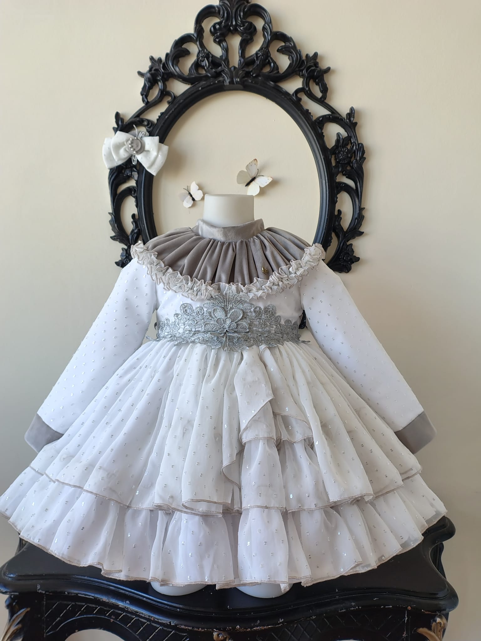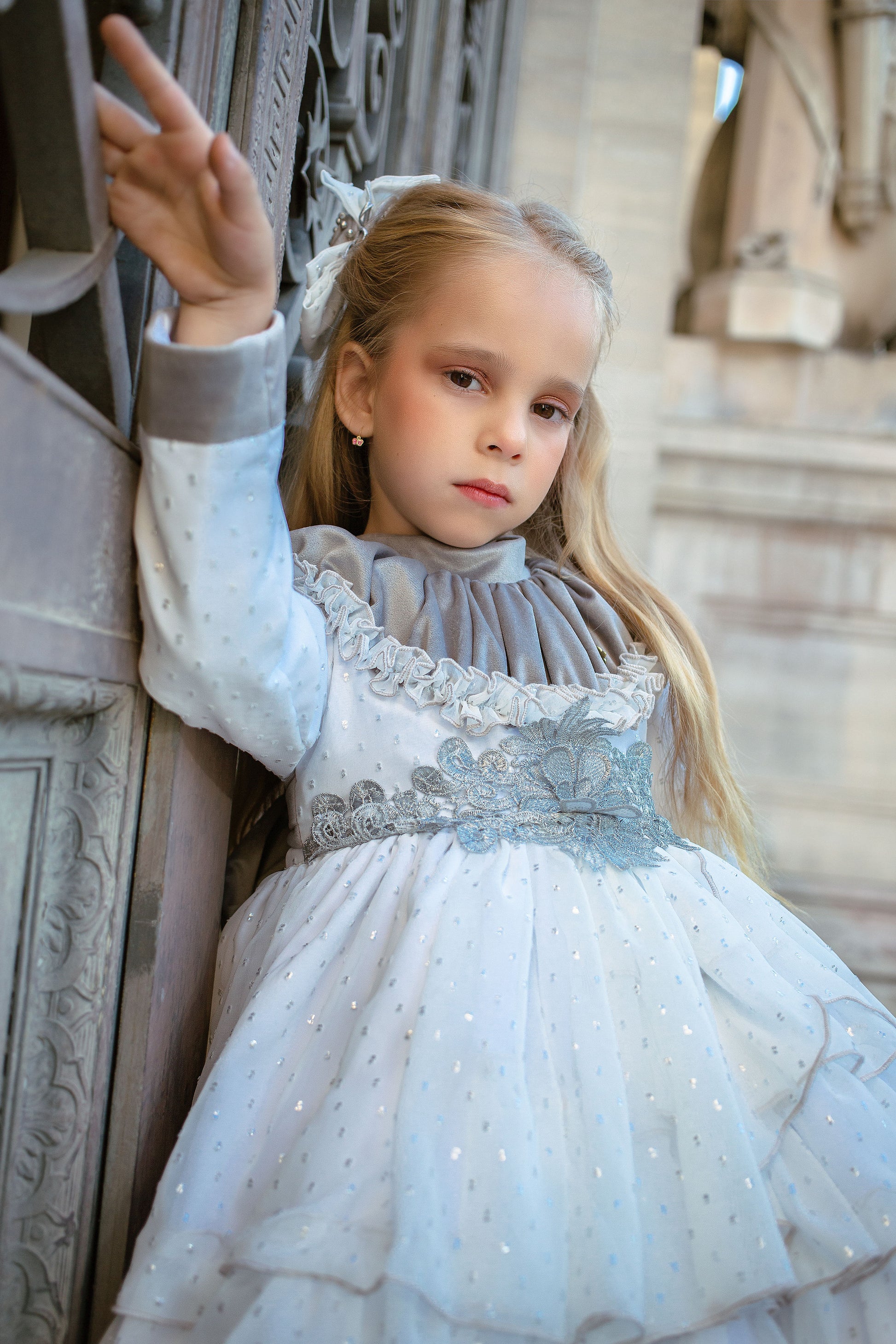Vestido de ceremonia infantil exclusivo, confeccionado en plumeti gris con destellos plateados y detalles artesanales. Diseño atemporal y elegante de Meriche Alta Costura.