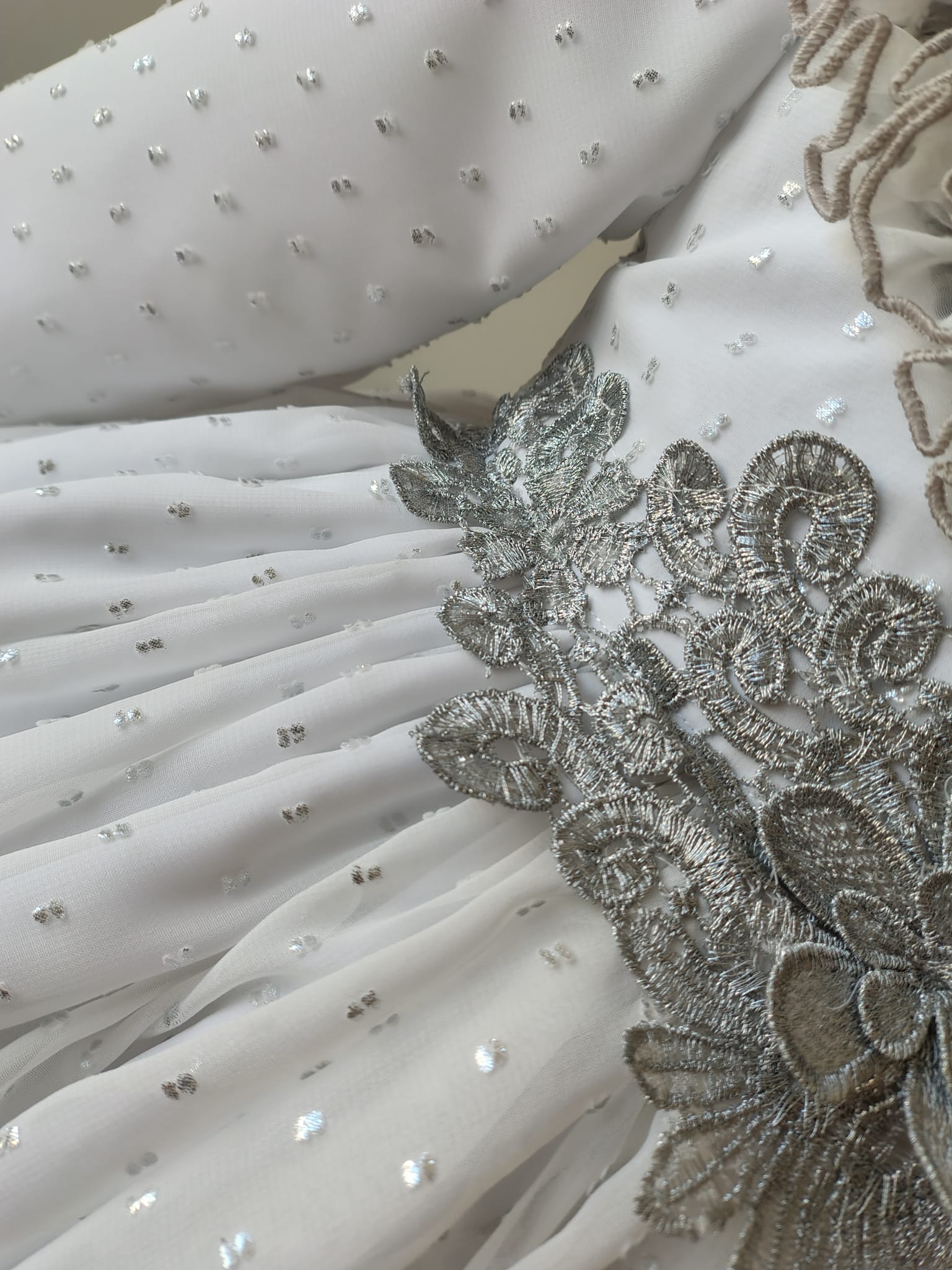 Descubre el vestido Marceline, una pieza única de la colección Heirloom de Meriche Alta Costura. Diseñado para ocasiones especiales, este vestido de niña destaca por su delicado tejido de plumeti gris con destellos plateados, que aporta brillo sutil y sofisticación.