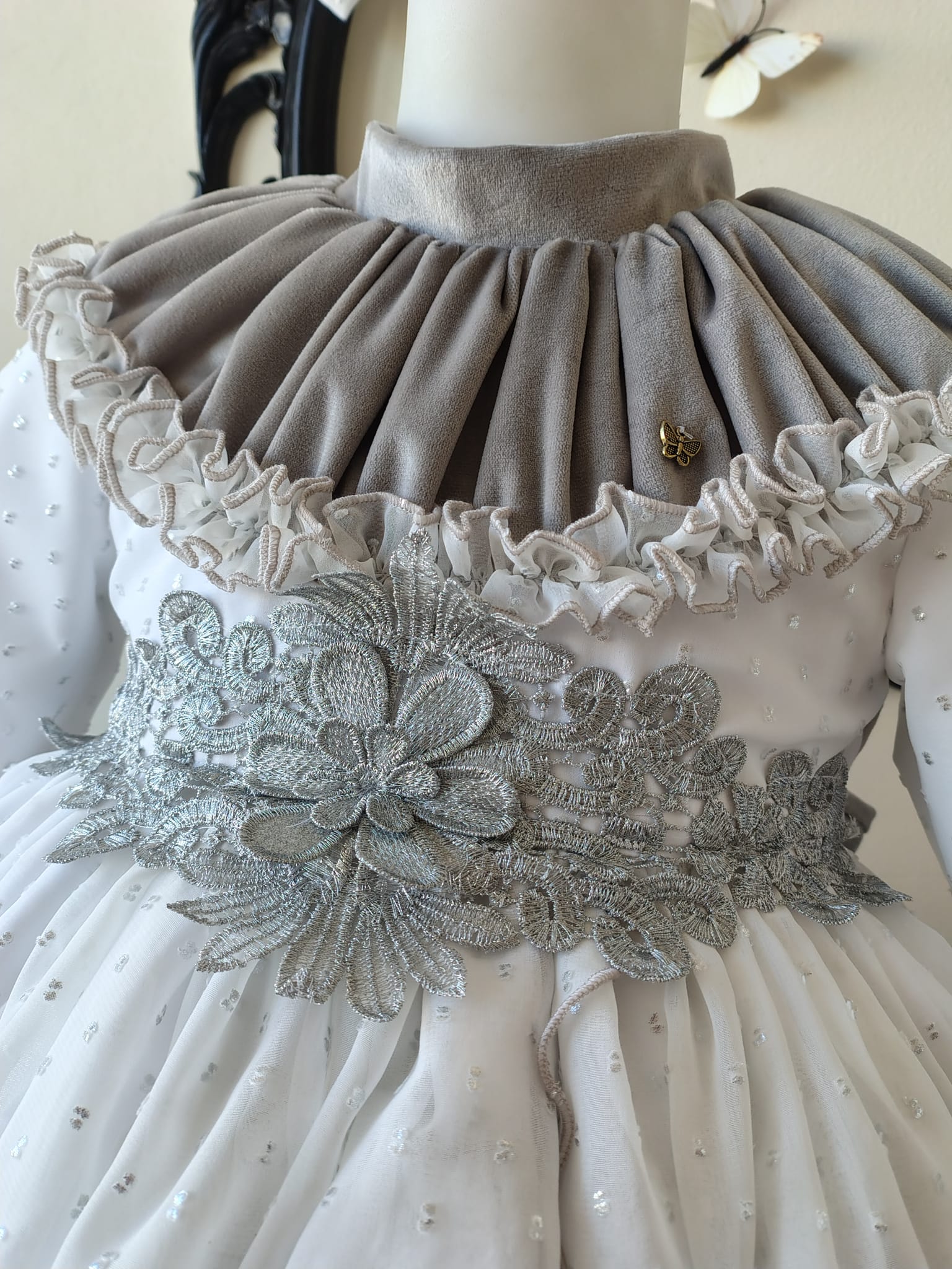 El cuello de terciopelo plisado en tono gris perla y el encaje bordado artesanal en la cintura evocan el encanto de la moda de herencia: prendas que trascienden el tiempo y se convierten en verdaderos tesoros familiares.